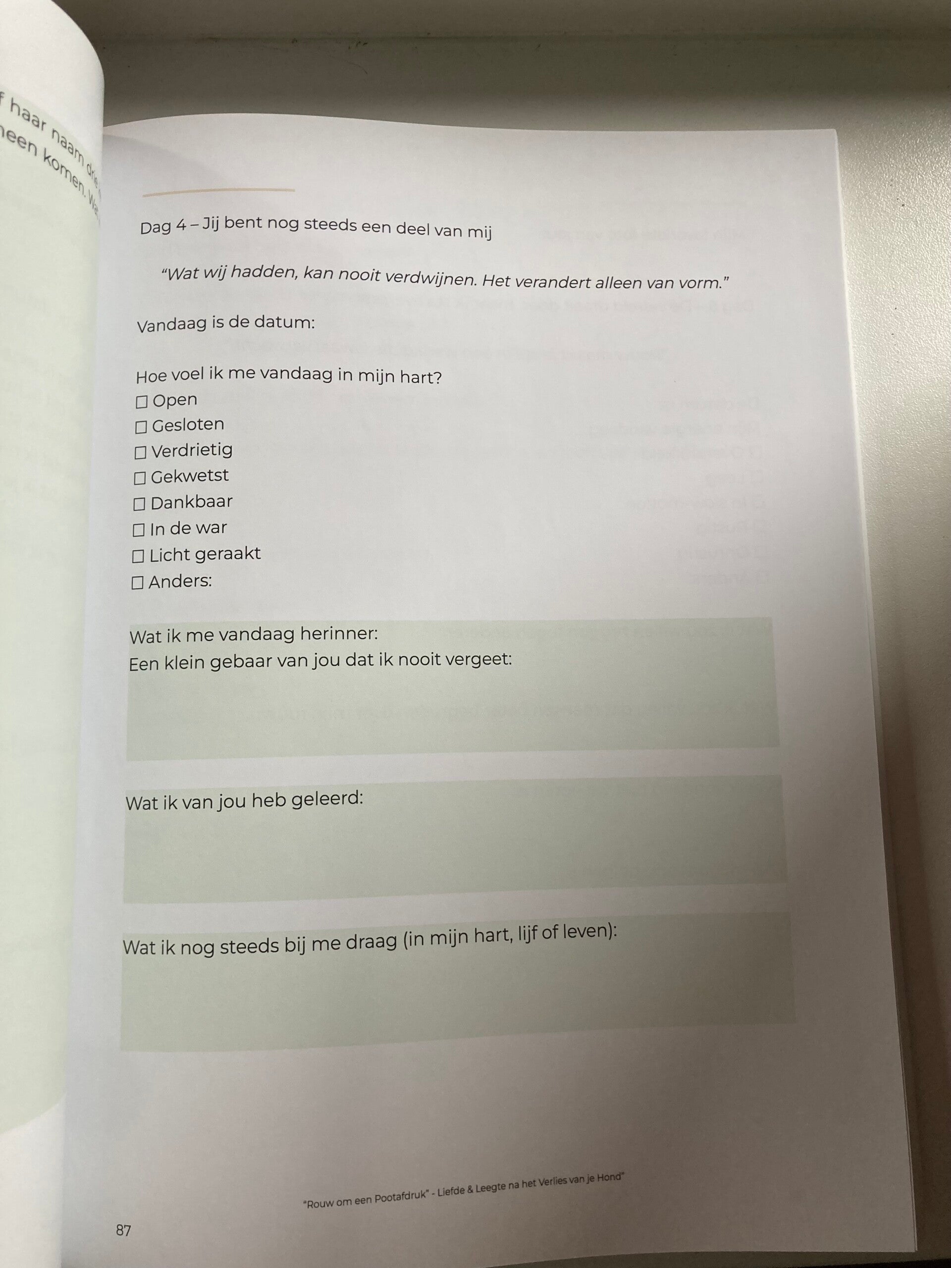 – steun in de vorm van rituelen, schrijfoefeningen en zelfzorgtips